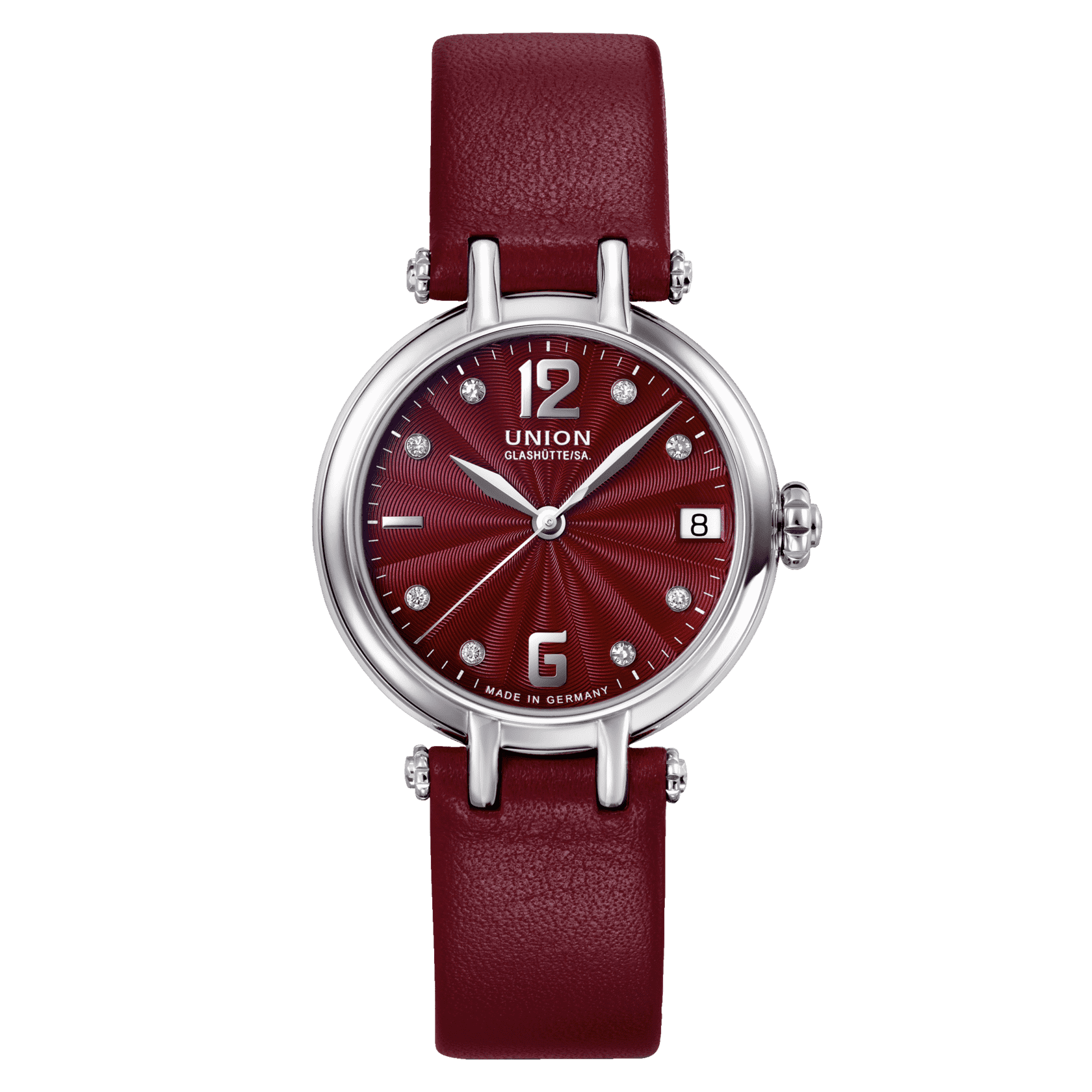 来自格拉苏蒂镇的宇联表——精密可靠,璀璨闪耀:Sirona 席萝娜系列采用高雅的精钢表壳,直径仅 32 毫米。加长表耳、造型精美的棕色表冠和深红色皮革表带,赋予腕表独特外观。此外,双面防眩目蓝宝石玻璃表镜也让人能清晰地欣赏到表盘镶嵌的 8 颗璀璨动人的钻石和日辉纹效果。这款红色女士腕表定会引人注目。